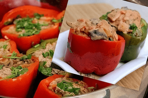 Смешать мясной фарш с овощами и рисом. По вкусу посолить, поперчить, добавить нарезанную зелень и специи. Перцы, очищенные от семян, нафаршировать начинкой.