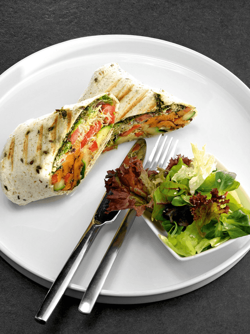 Буррито с жареными овощами и песто — это великолепное сочетание мексиканских традиций и свежести средиземноморской кухни. Родиной буррито считается Мексика, где тортильи с начинками стали символом уличной еды. В этом варианте сочетаются ароматные овощи, обжаренные на гриле, свежие салатные листья и пикантный песто, который придаёт блюду насыщенный вкус. Сладкий перец, цукини и батат наполняют буррито естественной сладостью, а огурцы и помидоры добавляют сочности. Лёгкий майонез и ростки люцерны делают его нежным, а кунжут придаёт изысканный ореховый оттенок. Это универсальное блюдо можно подать как лёгкий обед или ужин, оно идеально подходит для вегетарианского питания. Хрустящая, слегка поджаренная тортилья гармонично дополняет текстуру начинки, превращая буррито в настоящее гастрономическое удовольствие.