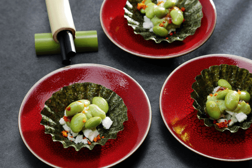 Эдамаме с бобовым кремом — изысканная закуска японской кухни, сочетающая нежность бобов, легкую пикантность халапеньо и глубину вкуса даши. Этот рецепт отражает традицию японской гастрономии, в которой особое внимание уделяется балансу текстур и ароматов. Крем из эдамаме с чесноком и луком-шалотом приобретает бархатистую консистенцию, а добавление рисового печенья в корзинках из нори обеспечивает хрустящую основу. Тончайший соус на основе даши и соевого соуса завершает композицию, подчеркивая естественную сладость бобов. Это блюдо идеально подойдет как элегантная закуска для вечеринки или как часть традиционного японского ужина, доставляя удовольствие как гурманам, так и любителям оригинальных вкусовых сочетаний.