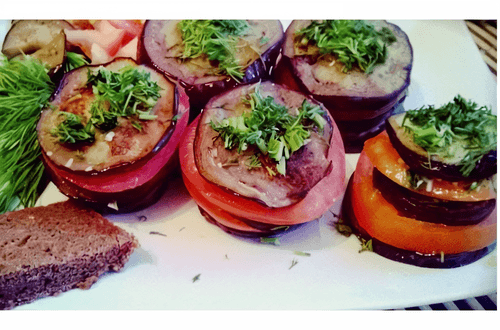 Помидоры нарезать кружками средней толщины. Зелень и чеснок мелко нарезать. Выкладывать ингредиенты необходимо следующим образом: баклажан, немного солим, сверху чеснок и помидор, далее на помидор зелень, чеснок и снова баклажан, не забываем солить. И так, чередуя два раза, получим желаемый размер.