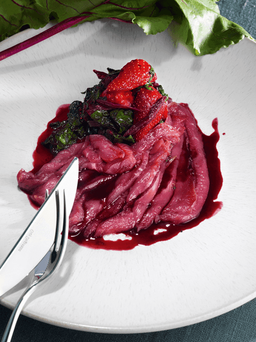 Утиное филе промыть от соли, нарезать тонкими ломтиками и подавать со свекольной ботвой и клубникой.