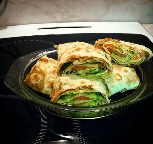 Лаваш развернуть и смазать сыром, затем посыпать укропом и выложить семгу, сверху выложить огурцы и салат — немного посолить. Свернут рулетом и разрезать пополам.