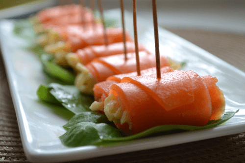 На широкую сторону морковной полоски выложить часть начинки или размазать по всей длине. Свернуть рулетиком. По желанию наколоть шпажкой.