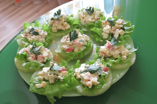 Закуска на кольцах ананаса — это оригинальное и освежающее блюдо, которое сочетает сладость ананаса с нежностью сыра, крабовых палочек и яиц. Такое блюдо пришло из американской кухни, где любят экспериментировать с контрастами вкусов. Сочный ананас служит основой, а сверху располагается сливочная, слегка пикантная начинка, дополненная свежестью зеленого салата. Закуска не только красиво смотрится, но и обладает приятным балансом сладости и солености, делая ее идеальным выбором для легкого перекуса или праздничного фуршета. Подача на ананасовых кольцах придает ей особую элегантность, а сочетание текстур делает вкус насыщенным и многогранным.
