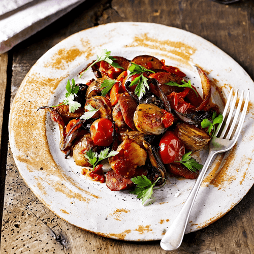 Пататас бравас — это блюдо с душой, которое объединяет тепло жареного картофеля, аромат пикантного маринованного перца и нежность краковской колбасы. Хотя оно несет в себе нотки испанской кухни, этот вариант с уксусными оттенками и свежестью петрушки впитал русский характер. Молодой картофель, слегка хрустящий снаружи и мягкий внутри, впитывает в себя соки перца, томатов и специй, создавая восхитительный баланс сладости и остроты. Колбаса, подрумяненная без масла, добавляет мясную глубину, а малиновый и бальзамический уксус придают блюду легкую кислинку, обогащающую вкус. Идеально как горячая закуска или основное блюдо для уютного вечера с близкими. Это простое, но выразительное блюдо раскрывает богатство своих вкусов в каждом кусочке.