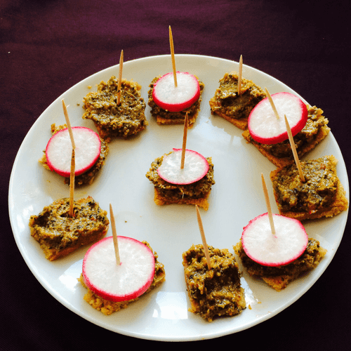Зубочисткой проткните кусок редиски (если вы положите редиску на мини тост с пастой, то при протыкании зубочисткой редис выдавит всю пасту) и затем воткните зубочистку в тост.