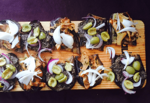 На 0,5 баклажанов выложите лисички, на вторую половину баклажанов — тапенад. Разложите их на сервировочной тарелке или доске вперемежку.