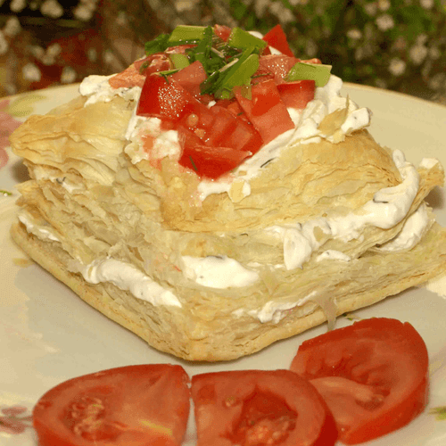 Милфей с брынзой, йогуртом и зеленью – это изысканное блюдо, сочетающее воздушную хрусткость слоёного теста с нежной сливочностью брынзы и йогурта. Этот рецепт – отражение французской кулинарной традиции, адаптированной под европейские вкусовые предпочтения. Крем на основе брынзы и йогурта придаёт блюду пикантность и свежесть, а зелень и помидоры делают его визуально привлекательным и насыщенным вкусом. Милфей идеально подходит как лёгкая закуска или элегантный аперитив, а его охлаждённая текстура делает его особенно приятным в летние дни. В каждом слое этого блюда сочетаются хрустящая основа и бархатистая нежность начинки, создавая гармоничный вкусовой баланс. Изысканный внешний вид и богатый вкус делают этот милфей прекрасным выбором для праздничного стола и гастрономического наслаждения.