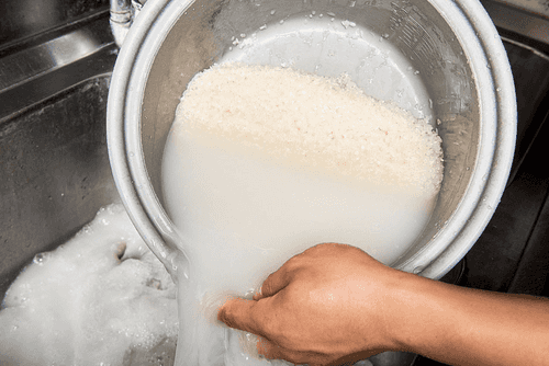 Рис основательно промыть в холодной воде — пять, а то и шесть раз, пока вода не перестанет быть мутной и станет полностью прозрачной. Промывая, рис не нужно сильно тереть, чтобы рисинки не ломались: надо просто перебирать его, помешивая, рукой.