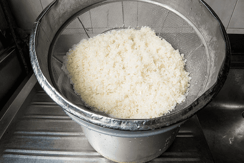 Затем переложить рис в сито, установленное над емкостью, и оставить на пятнадцать-двадцать минут: вода стечет — и заодно необходимое ее количество проникнет в рис. После этого отварить его в рисоварке в равном по весу количестве воды — на это уйдет примерно полчаса. Еще минут пятнадцать он должен провести в выключенной, но закрытой рисоварке.