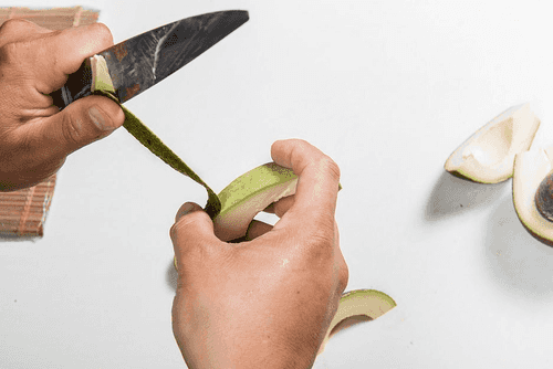Очистить авокадо. Понадобятся узкие дольки, и удобнее всего сначала вырезать их из целого плода, а уже потом отделить от косточки и снять кожуру.