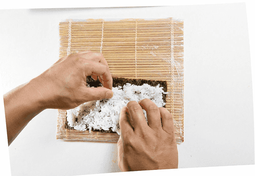Циновку для роллов обернуть пищевой пленкой. На матовую сторону листа нори по всей его площади выложить теплый рис тонким, толщиной в одну рисинку, слоем.