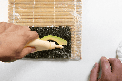 Перевернуть лист нори рисом вниз. Выложить на середину две дольки авокадо. Рядом провести линию японским майонезом. Завершить полоской крабового мяса.