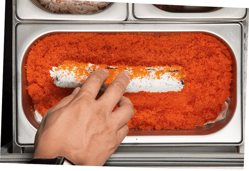 Свернуть ролл — делать это нужно мягко, не пережимая, а только придавая форму: можно квадратную в сечении, а можно круглую. Обвалять ролл в тобико, то есть икре летучей рыбы.