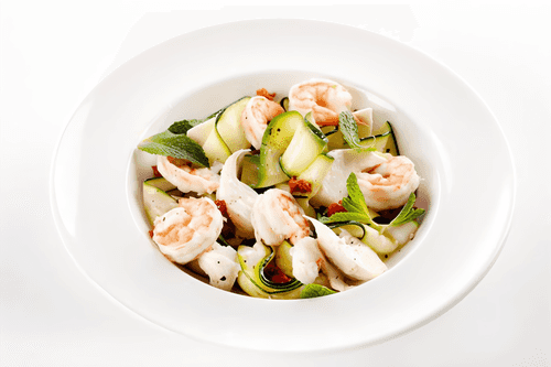 Цукини разложите по тарелкам, добавьте креветки, кусочки моцареллы, вяленые томаты, присыпьте все листиками мяты и подавайте на стол.