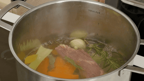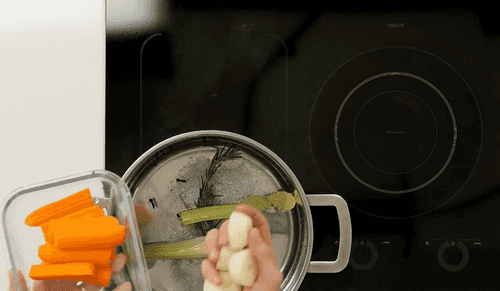 Крупную соль, горошины черного перца, гвоздику, лавровый лист, шалфей, разрезанные пополам морковь и сельдерей и розмарин смешать в кастрюле и залить полутора литрами воды.