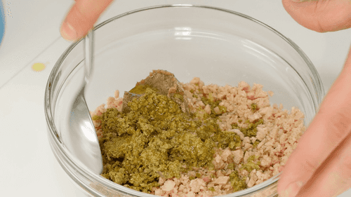 Отдельно смешать оставшееся масло, тунец, измельченные каперсы, лимонный сок и измельченные анчоусы. Взбить в соус, поперчить, смешать с яичной смесью.