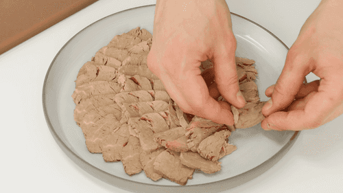 Тонко нарезать мясо и выложить на блюдо.