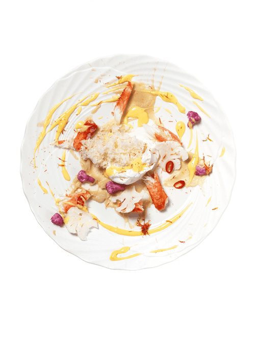 Оставшуюся цветную капусту нарезать на мандолине тонкими дольками, бросить их в холодную воду. Мясо краба разобрать на небольшие куски. Выложить на тарелки пюре из цветной капусты, затем — мясо краба, потом яйцо пашот. Полить яичным соусом и украсить капустой.