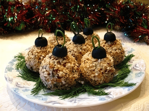 Скатываем из полученной массы шарики. Обваливаем в ореховой крошке, из половинок оливок делаем «крепления», из зелени — петельки.