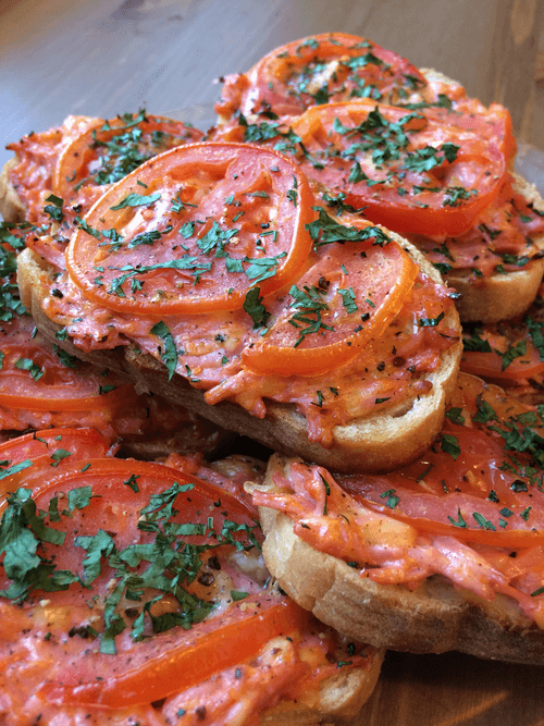 Выкладываем полученную массу на нарезанные кусочки батона, сверху кладем по кусочку помидора.