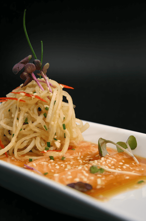 Карпаччо из филе лосося в имбирном маринаде с лапшой из дайкона