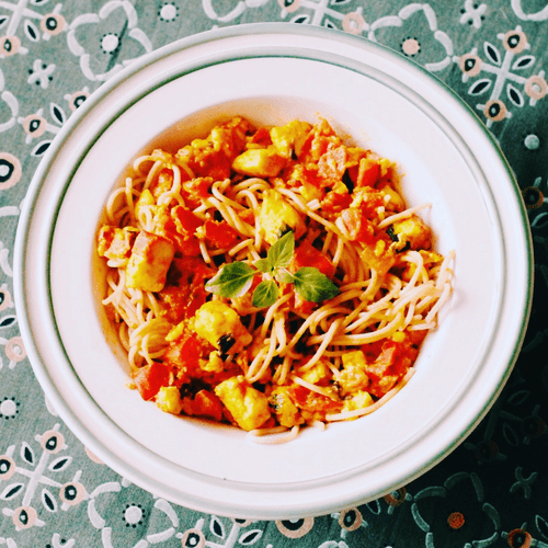 Разогреть сковороду с растительным маслом, насыпать куркуму и через пару секунд высыпать сыр. Обжарить до румяной корочки. Добавить нарезанные помидоры и посолить. Пусть тушится на небольшом огне, пока помидоры не разварятся.
