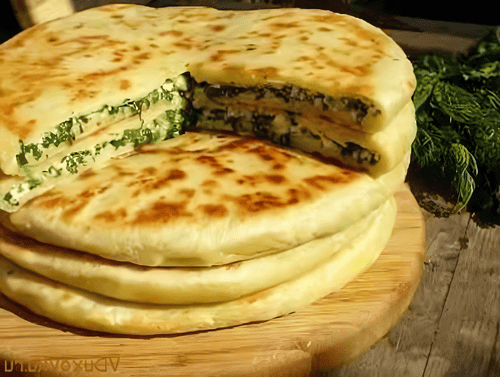 В центр лепешки поместить начинку из панира, зелени и специй. Защипать края лепешки и еще раз раскатать в не очень тонкую лепешку. Так же поступить с остальными лепешками.