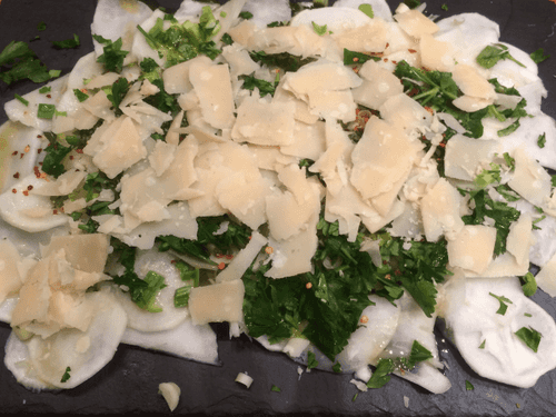 Карпаччо из белой репы — это утонченное блюдо, вдохновленное итальянскими традициями, но адаптированное с европейским акцентом. Легкость белой репы, нарезанной тонкими лепестками, создает нежную текстуру, которая идеально сочетается с освежающей зеленью петрушки и пикантными перьями чеснока. Легкая острота хлопьев чили добавляет этому блюду характер, а лимонно-оливковая заправка подчеркивает его природную свежесть. Пармезан, нарезанный тонкими пластинками, завершает композицию, придавая карпаччо глубину вкуса и насыщенность. Идеально подходит как изысканная закуска для легкого аперитива или как часть праздничного ужина. Подавать охлажденным, чтобы ароматы гармонично раскрылись и подчёркнули природную элегантность каждого ингредиента.
