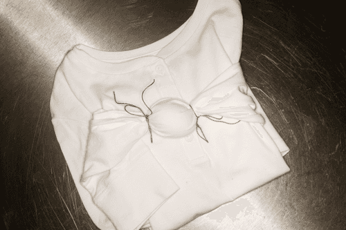 Положить яйцо в рукав футболки и плотно перевязать кулинарной нитью ровно у концов яйца; вместо рукава можно использовать и полотенце — главное, тщательно завернуть содержимое.