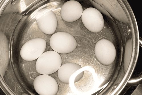 Положить яйца в кастрюлю с холодной водой, поставить на огонь, довести воду до слабого кипения и варить яйца еще десять минут.