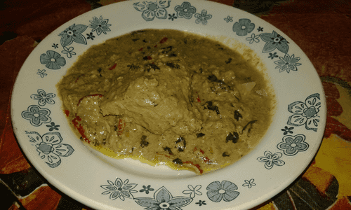 Смешать лук с толченой зеленью, орехами, хмели-сунели, шафраном, винным уксусом и красным перцем. Посолить и поперчить по вкусу.