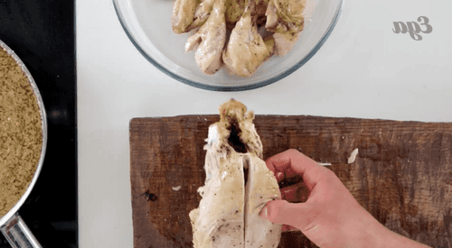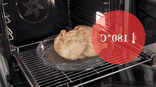 Достать курицу, натереть ее солью и перцем, положить на противень и отправить в духовку, разогретую до 180 градусов, где она должна подрумяниться. Готовую курицу достать из духовки минут через 30–40. Готовность можно определить, прокалывая ее спицей или ножом: если сок прозрачный, то птица готова.