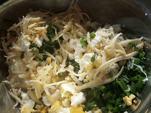 Пучок зеленого лука мелко нарезать, добавить 2 очень крутых, но помятых )) яйца и 50 г натертого сыра.