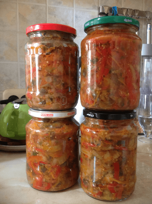 Довести смесь до кипения и опустить в нее перец (соломкой), морковь (натертую на корейской терке) и баклажаны (кубиками), варить все после закипания 30–40 минут на небольшом огне под крышкой, периодически помешивая.