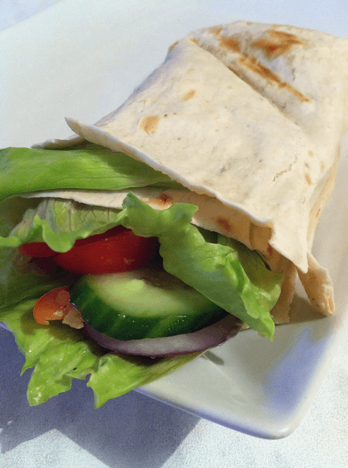 Лаваш разрезать на квадраты 20х20 см. Намазать лаваш горчицей и майонезом и выложить кусочки индейки. Затем разместить салат. На салат выложить нарезанный кружочками помидор, огурец и лук.