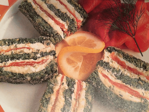 Остывший брусочек шпината разрезаем на 3 поперечных пласта. Нижнюю полоску покрываем сырной начинкой, сверху укладываем 1/3 тонко нарезанного копченого лосося или чуть больше. Будет 2 слоя лосося, однако, имеет смысл оставить лосось для украшения.