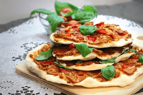 Готовые ламаджо выкладываем на тарелку. Сначала кладём одну лепешку мясом вверх, затем переворачиваем на нее вторую лепешку мясом вниз. И так далее.