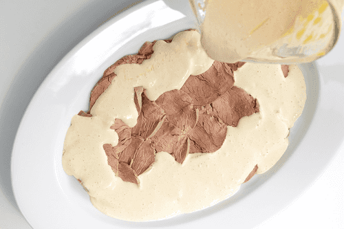 Телятину охладить, нарезать тонкими ломтиками и залить соусом. Накрыть пленкой, дать постоять примерно 30 минут и подавать в качестве холодной закуски.