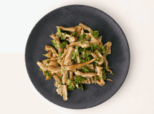 Смешать в большой миске острое масло, куриный бульон, соль, черный уксус, сахар, соевый соус, кунжут и мелко нарезанную зелень. Добавить уши и перемешать.