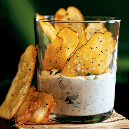Эти изысканные картофельные чипсы с ароматными травами — фирменное блюдо ресторана Maxim's, созданное талантливым шефом Чарлзом Паркером. Их тонкие, хрустящие ломтики картофеля пропитаны сливочным маслом и украшены свежими листьями эстрагона, кервеля и шнитт-лука, придающими пикантность и утонченность. Легкая морская соль подчеркивает богатый вкус, а запекание в духовке делает их воздушными и нежными. Этот рецепт соединяет в себе французскую утонченность и простоту деревенской кухни, создавая идеальное сочетание текстур и ароматов. Идеально подходит как элегантная закуска к вину или как хрустящий гарнир к основным блюдам. Вкус этих чипсов раскрывается медленно, оставляя приятное травяное послевкусие, а их золотистая корочка делает их настоящим гастрономическим произведением искусства.
