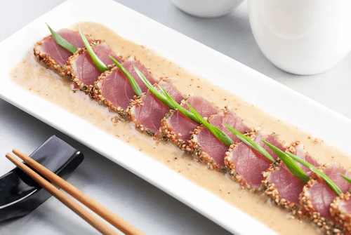 Тунец фурикакэ в соусе мустард — это изысканное блюдо, сочетающее хрустящую панировку с насыщенным ароматом дижонской горчицы и сладковатой ноткой груши. Истоки этого рецепта восходят к современным тенденциям фьюжн-кухни, где японские ингредиенты, такие как фурикакэ, гармонично сливаются с европейскими соусами. Вкус блюда — контраст хрустящей корочки и нежного, сочного тунца, пропитанного изысканным соусом с легкой пикантностью. Идеально подходит для подачи на званый ужин или как элегантная закуска в ресторане. Ломтики тунца, уложенные на белоснежный соус, создают живописную композицию, достойную гастрономического искусства. Подача с луком-резанцем придает свежесть и завершающий штрих утончённости.