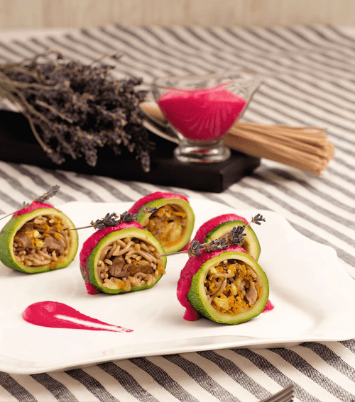 Цукини фаршированные лапшой соба с говядиной под свекольным соусом