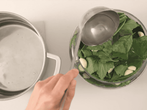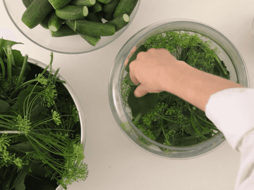 В банку выложить часть листьев хрена, вишни, смородины, стеблей укропа и чеснока, затем огурцы, далее еще один слой зелени и чеснока, снова огурцы и закрыть их зеленью.