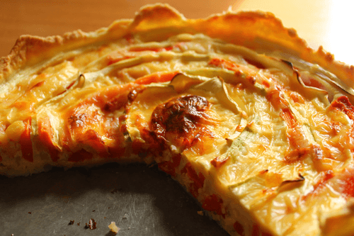 Для начинки взбить яйца со сливками и сыром,посолить и поперчить. Морковь и цуккини начать выкладывать чередуя, спиралью от бортика. В пустоты вложить по ломтику перца. Залить сырной смесью и выпекать в течение 20 минут. Подавать можно как холодным, так и горячим. К тарту можно подать салат из помидоров черри и базилика, заправленный лимонным соком и белым бальзамическим уксусом.