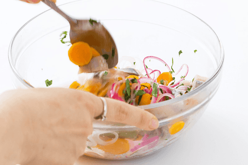 Нарезать луковицу и морковь кольцами. Смешать в кастрюле среднего размера одну чайную ложку уксуса, две чайные ложки сахара, три чайные ложки воды, лавровый лист и пять горошин душистого перца. Довести маринад до кипения и варить, пока не растворится сахар, около пяти минут. Охладить.