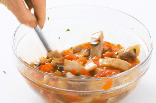 Оставшуюся сельдь также нарезать. Помидоры черри мелко нарезать и смешать с томатным соком, томатным пюре, оливковым маслом, одной чайной ложкой сахара и парой капель уксуса. Смешать селедку с томатным маринадом и выдержать в холодильнике минимум четыре часа.