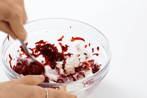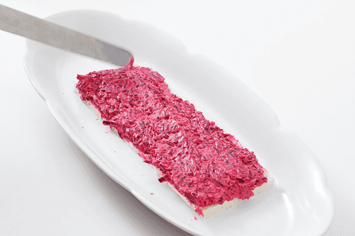 Свеклу сварить и натереть на терке. Смешать с двумя столовыми ложками сливочного сыра и одной ложкой майонеза.