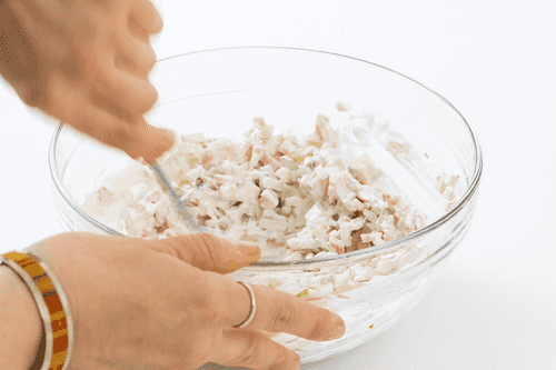Нарезать мелко два вареных куриных яйца и чеснок. Перемешать с двумя столовыми ложками сметаны и таким же количеством майонеза, добавив несколько капель вустерширского соуса.