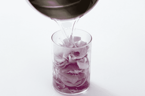 Красный лук нарезать на дольки. Уксус, воду, соль и сахар вскипятить. Залить лук рассолом. Оставить в холодильнике на четыре часа.